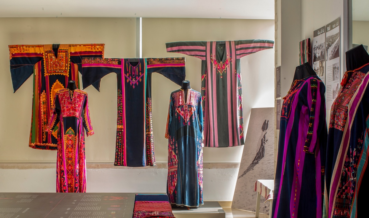 The display is dedicated to Maryam and Abdullah, who were killed by an air strike at the hands of the Israeli Occupation Forces two days after their wedding. The exhibit features the traditional dress of Qastina village, which was depopulated in 1948, and traditional bridal handkerchiefs crafted by women in Gaza Refugee Camp in Jordan.